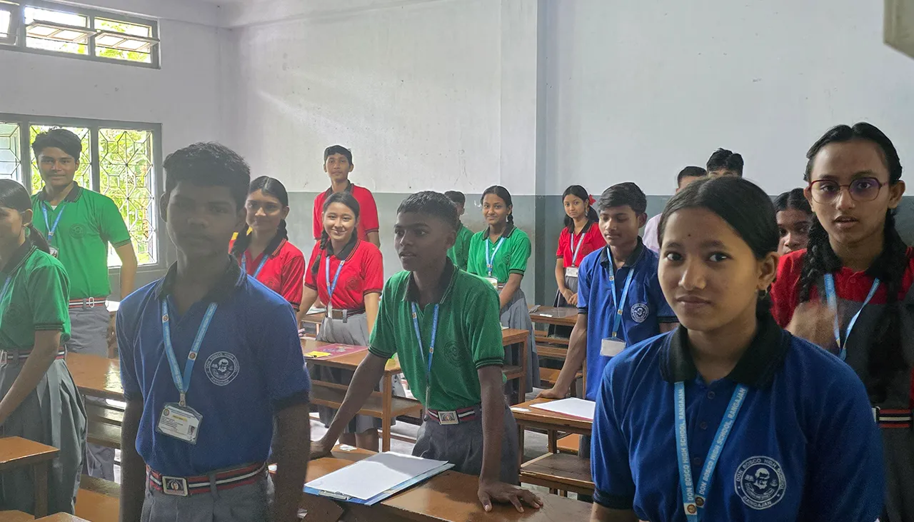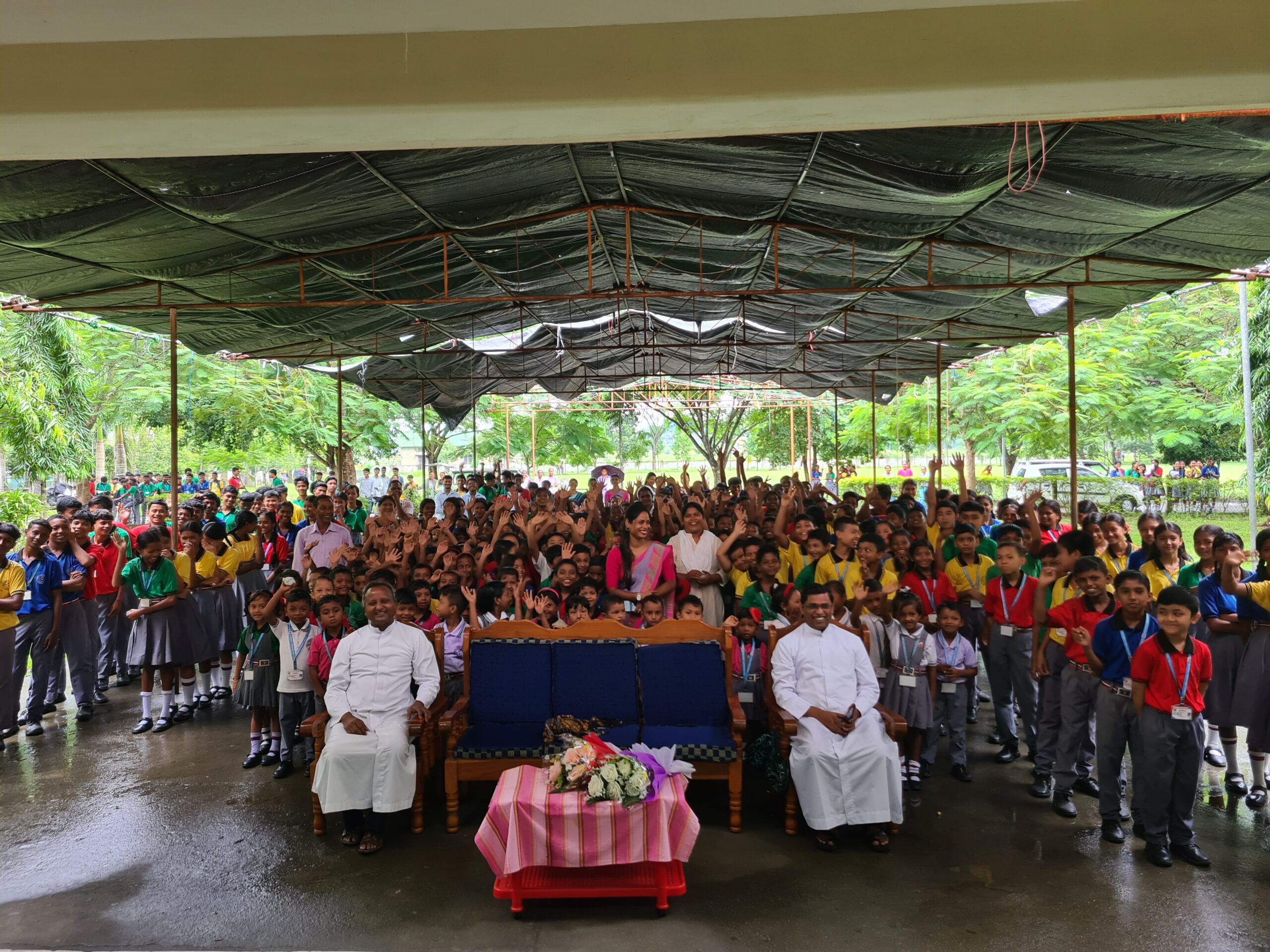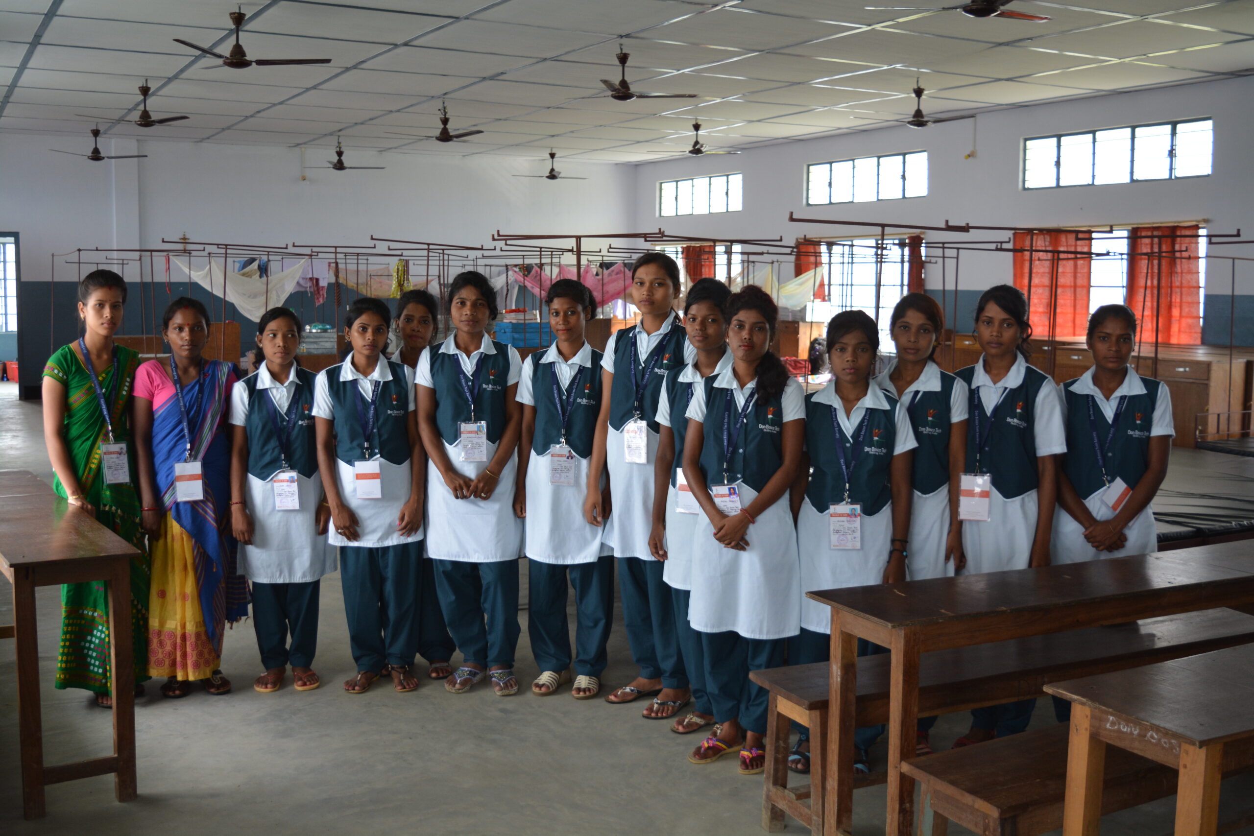 Auf den Fotos sehen Sie vergleichbar ausgestattete Räumlichkeiten: Waschraum, Speiseraum und Flur des Wohnheims der Don Bosco School Rangajan, die wir 2024 persönlich besuchen konnten.